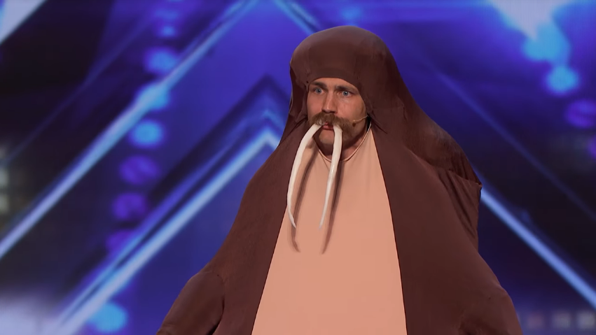 Sethward returned for Season 14. His audition in Episode 1403 consisted of first standing on stage dressed in a giraffe costume and telling a story about how he was dropped on his head at birth. Howie Mandel , Gabrielle Union , Julianne Hough and Simon Cowell all buzzed the act. While being dragged off the stage by Terry Crews, he then flashed the audience. The verdict was untelevised but all of the judges likely voted no eliminating him from the competition. Afterwards, he later returned to the stage dressed in a walrus costume in which he played with beach balls and rolled off the stage. Although Howie and Simon voted "yes," Gabrielle and Julianne voted "no," eliminating Sethward from the competition.